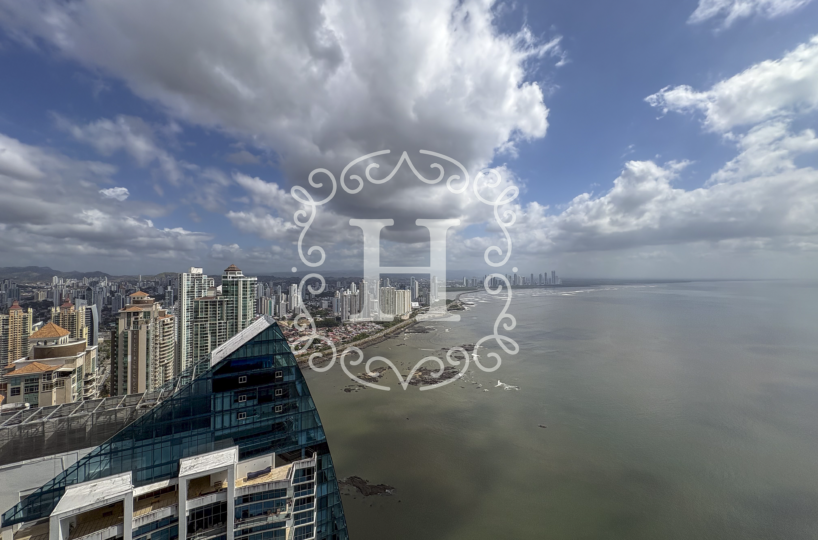 Located on the 50th level of the tower, the apartment enjoys elevated views that capture both the surrounding Panama City Panama skyline and the Pacific Ocean.