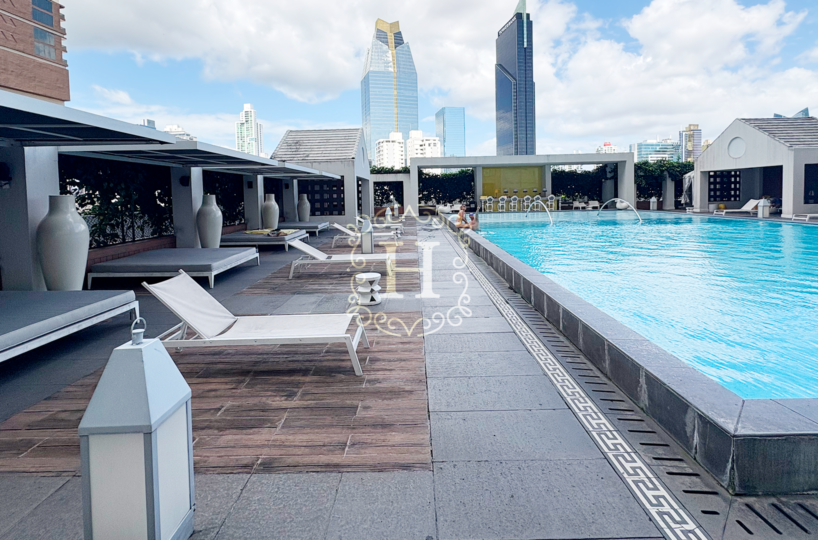 Hotel-style pool area with cabanas