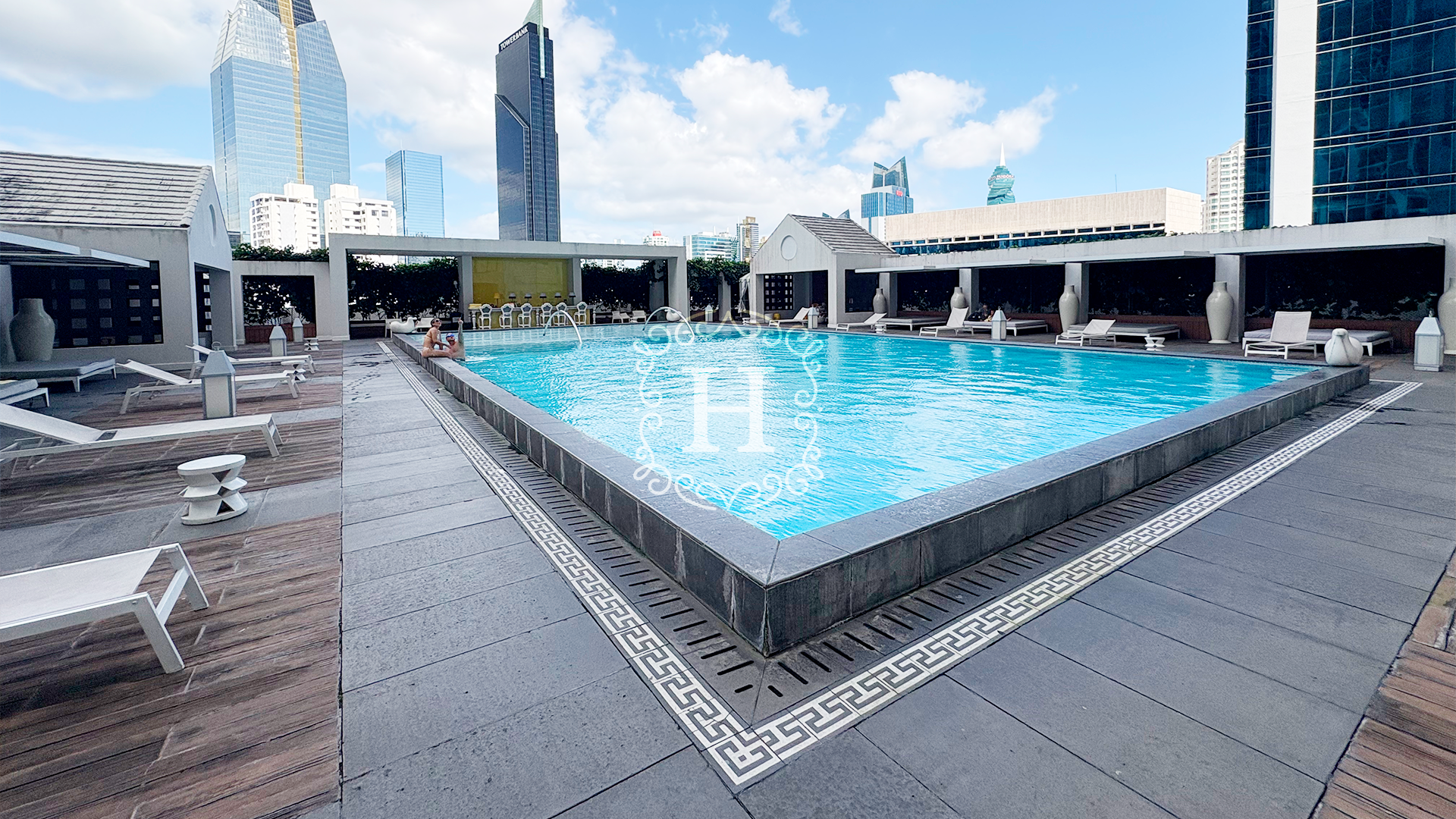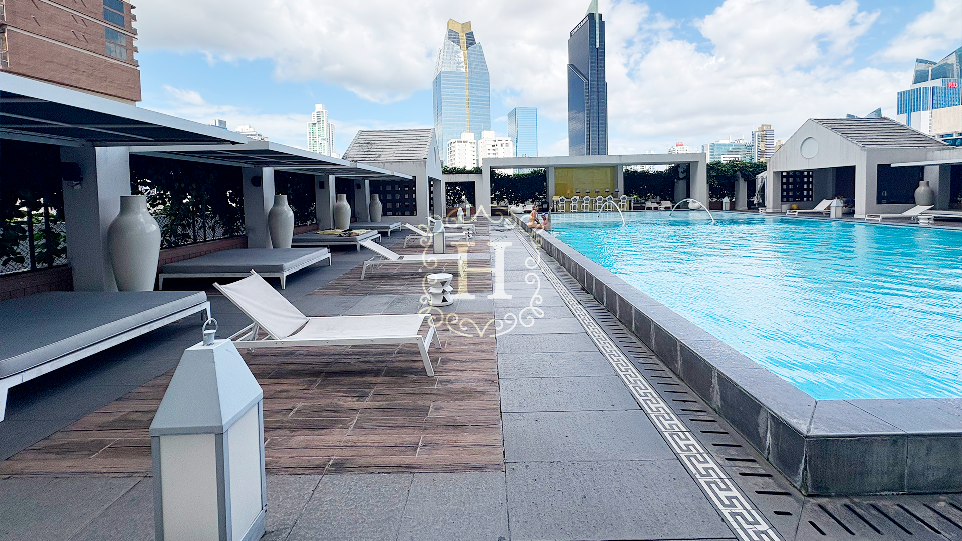 Hotel-style pool area with cabanas